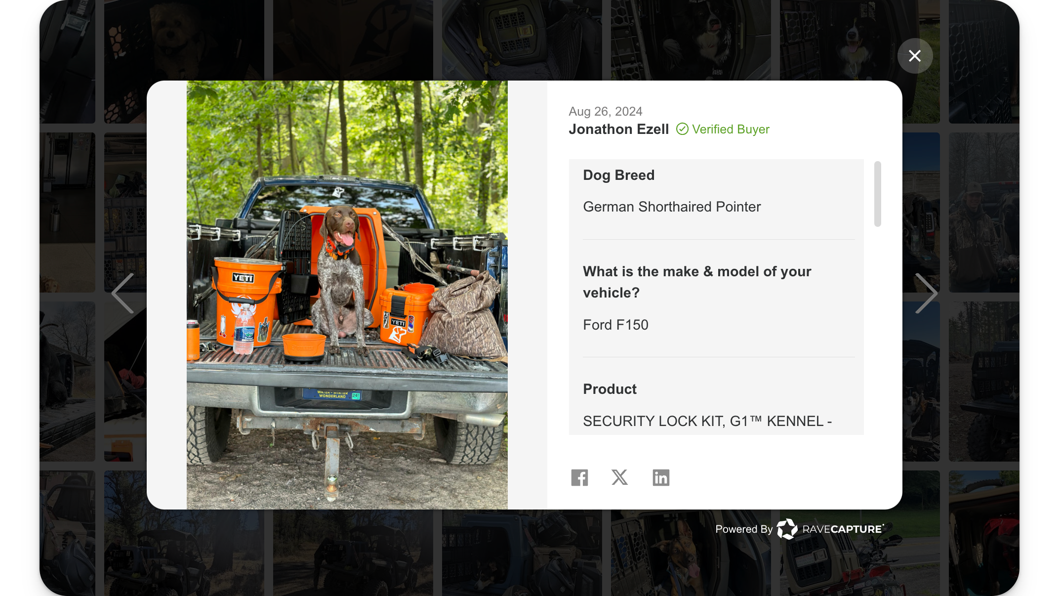 - Context is king: The photo of the dog in the truck bed is great, but it becomes even more powerful with the context provided by the survey. Knowing it’s a German Shorthaired Pointer in a Ford F150, using a SECURITY LOCK KIT, G1™ KENNEL adds depth to the story and provides valuable information for potential buyers.